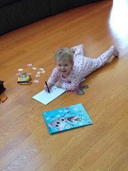 Give your child some crayons and a paper to scribble on,or a doodle pad to scribble on.Make  sure she doesn’t put the crayon in her mouth.